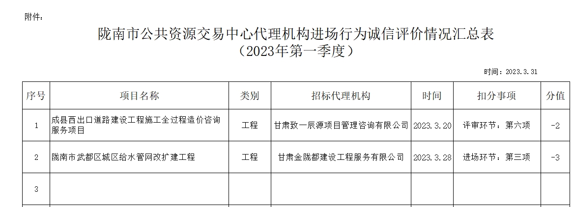 根據(jù)《甘肅省公共資源交易代理機(jī)構(gòu)管理辦法》(甘政辦發(fā)〔2019〕107號(hào))和《隴南市公共資源交易中心代理機(jī)構(gòu)進(jìn)場行為誠信評(píng)價(jià)實(shí)施制度(試行)》規(guī)定,現(xiàn)對(duì)2023年第一季度,共2家代理機(jī)構(gòu)2條進(jìn)場行為誠信評(píng)價(jià)記錄予以通報(bào)(詳見附表)。請(qǐng)各代理機(jī)構(gòu)嚴(yán)格遵守各項(xiàng)規(guī)章制度、誠實(shí)守信,規(guī)范操作,為招標(biāo)人和采購人提供專業(yè)、高效、規(guī)范的招標(biāo)代理服務(wù)。