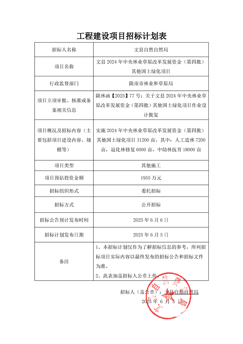文縣2024年中央林業(yè)草原改革發(fā)展資金(第四批)其他國土綠化項目招標計劃表.pdf
