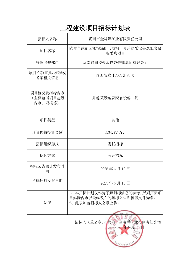 隴南市武都區(qū)龍溝煤礦馬池壩一號井綜采設(shè)備及配套設(shè)備采購項(xiàng)目
