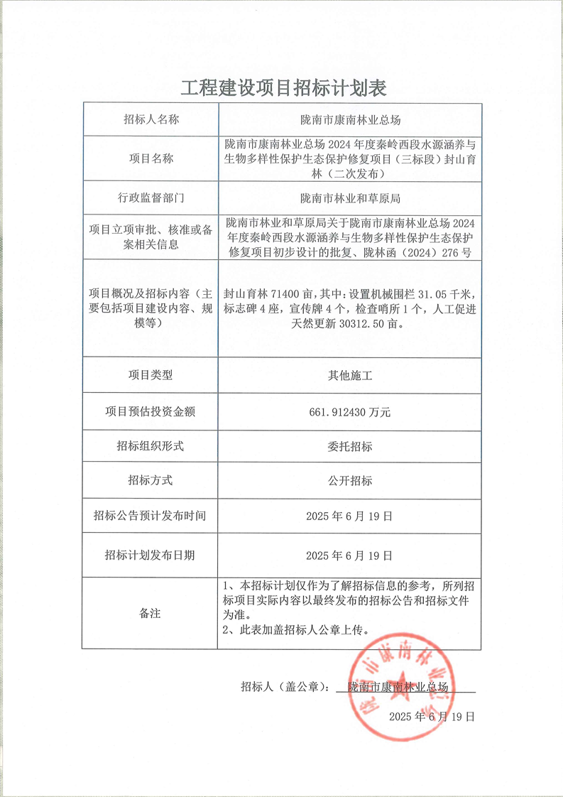 隴南市康南林業(yè)總場2024年度秦嶺西段水源涵養(yǎng)與生物多樣性保護生態(tài)保護修復項目(三標段)封山育林(二次發(fā)布)
