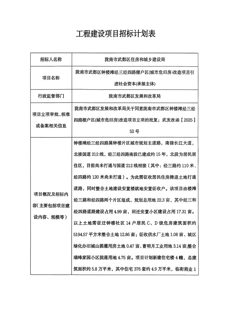 隴南市武都區(qū)鐘樓灘經(jīng)三經(jīng)四路棚戶區(qū)(城市危舊房)改造項目引進社會資本(承接主體)