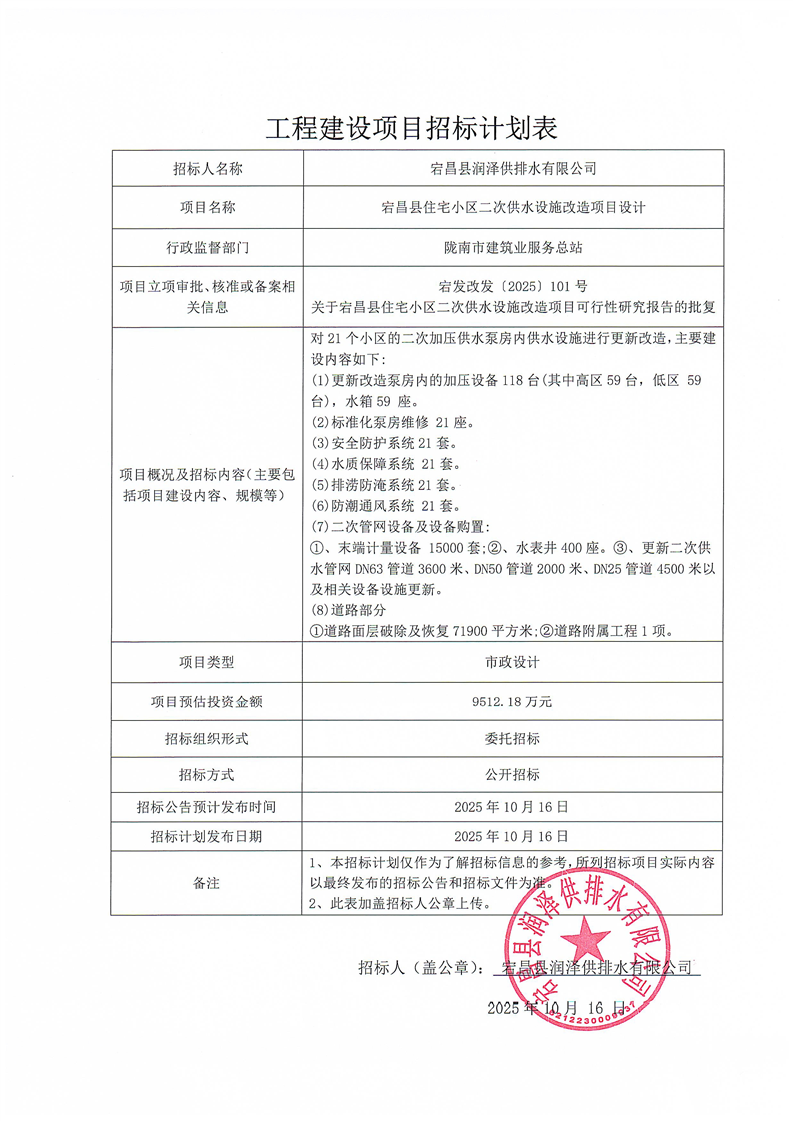 宕昌縣住宅小區(qū)二次供水設(shè)施改造項(xiàng)目設(shè)計(jì)