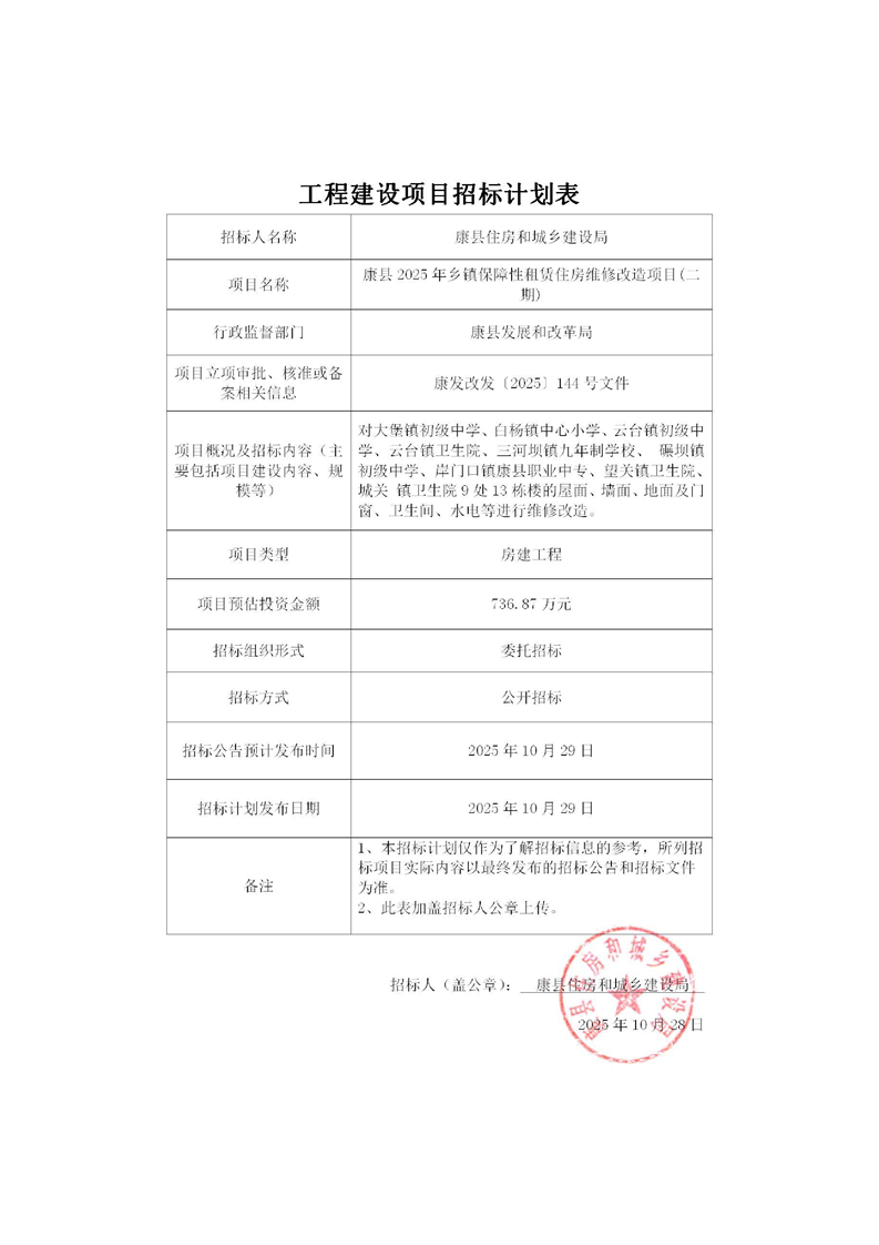康縣2025年鄉(xiāng)鎮(zhèn)保障性租賃住房維修改造項目(二期)