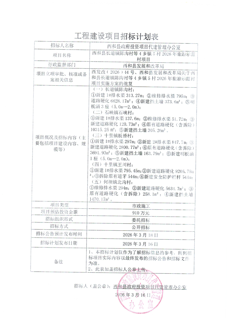 西和縣長道鎮(zhèn)陳溝村等4鄉(xiāng)鎮(zhèn)5村2026年旅游示范村項目
