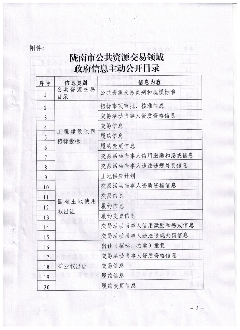 隴南市公共資源交易管理委員會(huì)辦公室關(guān)于印發(fā)隴南市公共資源交易領(lǐng)域政府信息主動(dòng)公開目錄的通知